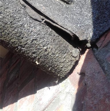 Nadat ik de kopse lat eraf heb gehaald heb ik beide platen in het vooraanzicht gefotografeerd. Dit is wat verder van de schoorsteen, waar de onderste plaat nog intact is. De bovenste plaat lijkt hier juist slechter, maar dat is op de plek waar de schroeven van de kopse lat erin zaten: