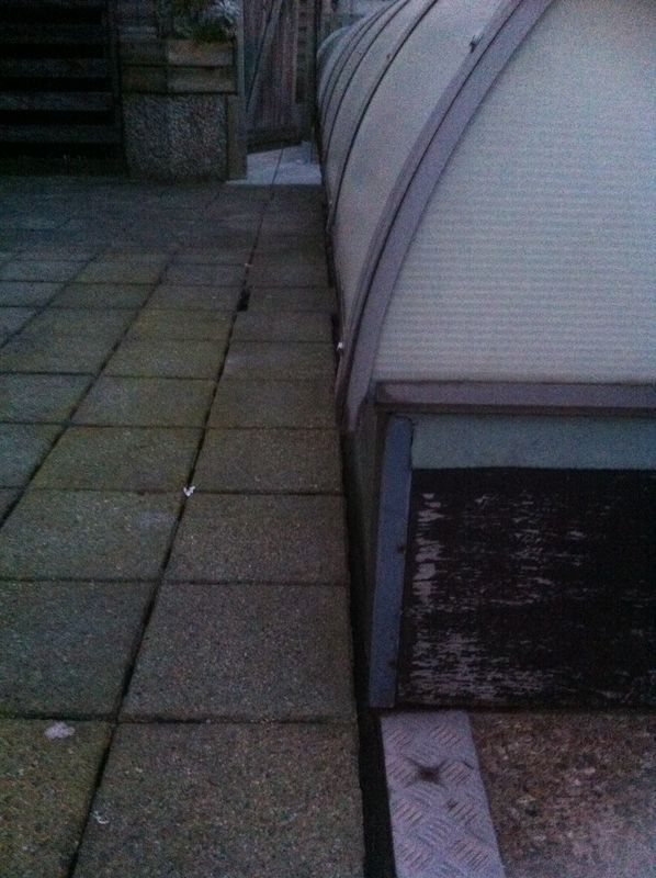 De ruimte tussen de vloertegels en de lichtkoepels: