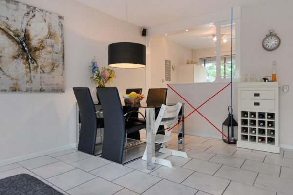 Zie plaatje hieronder. De lage afscheidingsmuur tussen de keuken en de woonkamer gaan we wegbreken maar het hoge gedeelte is net iets te kort (moet zo'n 25 cm bijkomen).