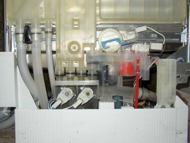 Voor nood een nieuwe wateraansluiting gemaakt (zonder waterstop) en het korte programma gestart, hij werkt het hele programma af alleen moet ik met de hand water erop en eraf zetten omdat hij anders het hele labirinth vult en dan loopt het water over net onder het blauwe hendeltje van de drukdoos.