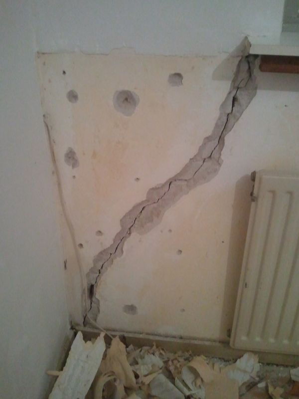Toen ik het behang van de muur trok (zat erg los aan de randen) kwam de scheur te voorschijn.
