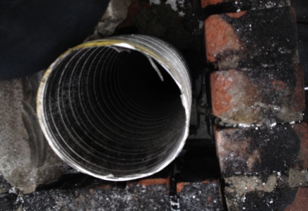 2) In het rookkanaal zit een flexibele RVS afvoer (zoiets, met een mooi rond gat in de muur: