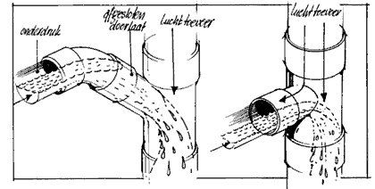 Roze is het bochtje aangesloten op de afvoer vanuit de wc en op het 45graden t-stuk