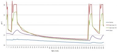 Hier nog een voorbeeld van het regelgedrag met de iSense na verlaging tot nachttemperatuur 19,5 gr.C. tot en met de twee eerste aanwarmingen van elk ongeveer 25 minuten. Een heel andere situatie als het met pendelgedrag met de Chronotherm