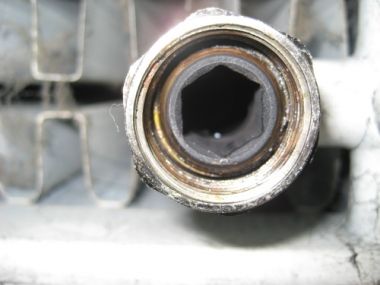 En een close-up van het gedeelte van de koppeling op de radiator zelf, ook helemaal droog en zwart: