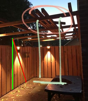 Deze pergola is niet optimaal als schommel. Links op de foto zit er een staander. Deze moet zijdelings geschoord worden, en de ligger moet verzwaard worden.