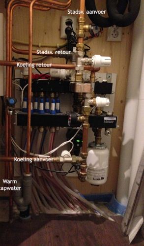 Kunt u misschien foto's van de vloerverwarmingsverdeler en misschien van de stadsverwarming plaatsen? Het lijkt me niet erg waarschijnlijk dat het schema helemaal klopt.