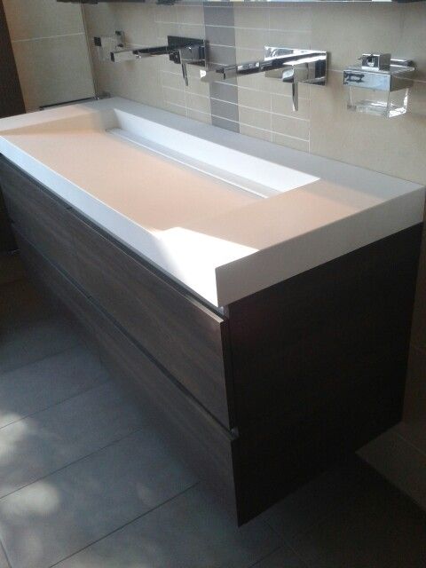 Ik wil een nieuwe, dubbele wastafel aansluiten op de afvoer. Nu is de wastafel een designmodel waarbij het water in een sleuf wegloopt. Aan de onderzijde zit een rond gat voor de afvoer. Geen idee hoe je zoiets noemt, sorry...